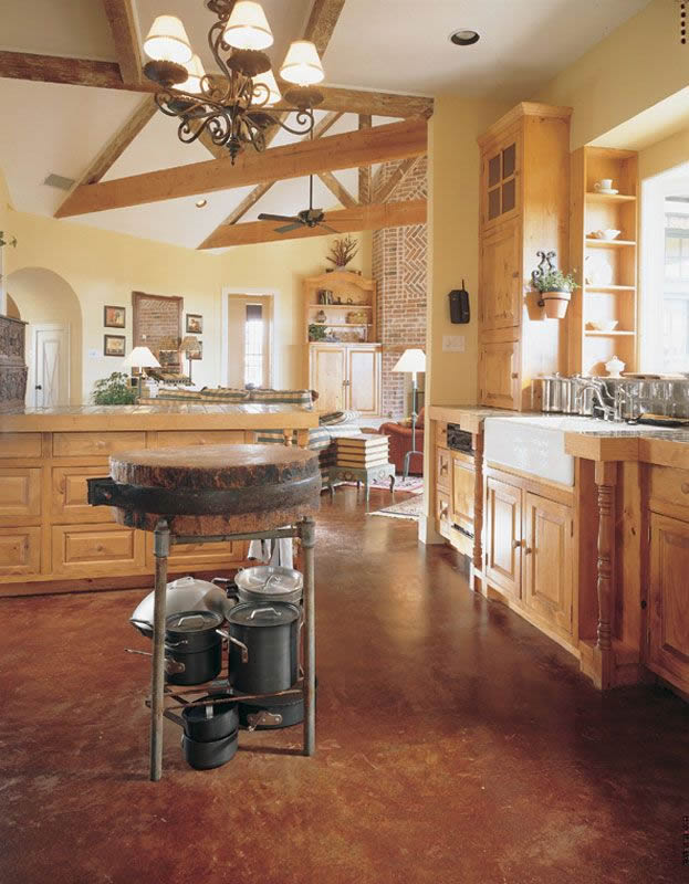 Stained concrete can be paired with other concrete finishing techniques to create a striking affect. These techniques include broom finishing, rough toweling, and sand blasting, exposing of aggregate and more. Broom finishing can create shadow effects, "swirl" and "fan" patterns on colored concrete. Rough trowel can mimic natural stone surface. Sandblasting can be used to create designs, or to give the concrete a two-tone appearance by removing a layer of color. Exposing of aggregate gives the concrete a natural textured look by letting the stone or gravel in the concrete show through.